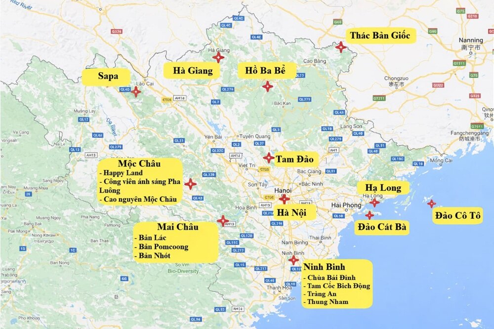 Ngoài ra, bản đồ còn làm nổi bật cung đường Hà Giang với những đèo đá ngoạn mục, hồ Ba Bể ở Bắc Kạn và cao nguyên Mộc Châu của Sơn La. Miền Bắc phù hợp với du lịch sinh thái, trekking, săn mây và khám phá bản sắc dân tộc thiểu số. Hệ thống cao tốc Hà Nội – Lào Cai và Hà Nội – Hải Phòng giúp rút ngắn thời gian di chuyển, tăng tính kết nối giữa các điểm đến.