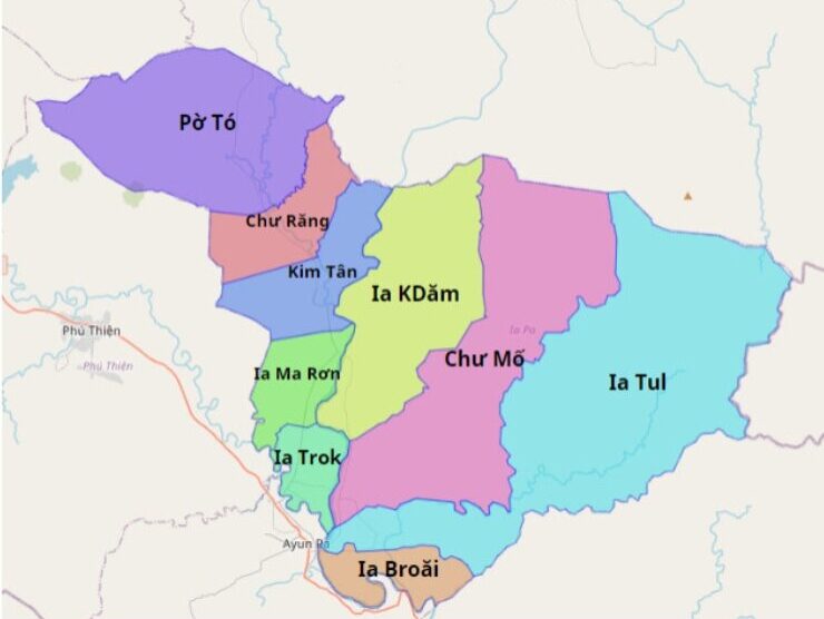 Phú Thiện nằm ở phía Nam tỉnh, nổi tiếng với cánh đồng lúa nước rộng lớn. Bản đồ hành chính huyện cho thấy hệ thống thủy lợi Ayun Hạ bao phủ nhiều xã. Huyện phát triển nông nghiệp lúa nước và chăn nuôi gia súc. Dân cư tập trung quanh các trục giao thông chính. Bản đồ hành chính đóng vai trò quan trọng trong quy hoạch sản xuất nông nghiệp và phát triển nông thôn mới.