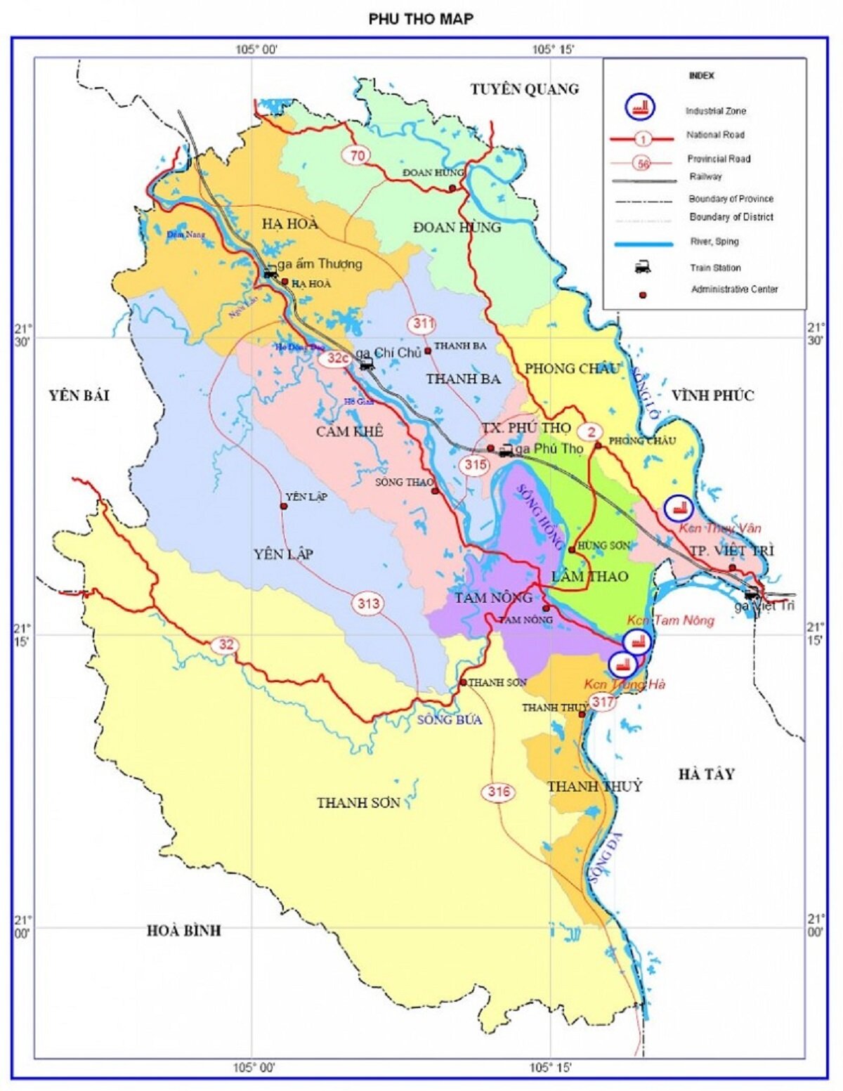 Nhờ vị trí thuận lợi, thị xã Phú Thọ đóng vai trò cầu nối giao thương giữa các huyện trong tỉnh. Bản đồ hành chính thị xã cung cấp thông tin chi tiết về ranh giới địa lý, hỗ trợ công tác quy hoạch đô thị và phát triển hạ tầng.
