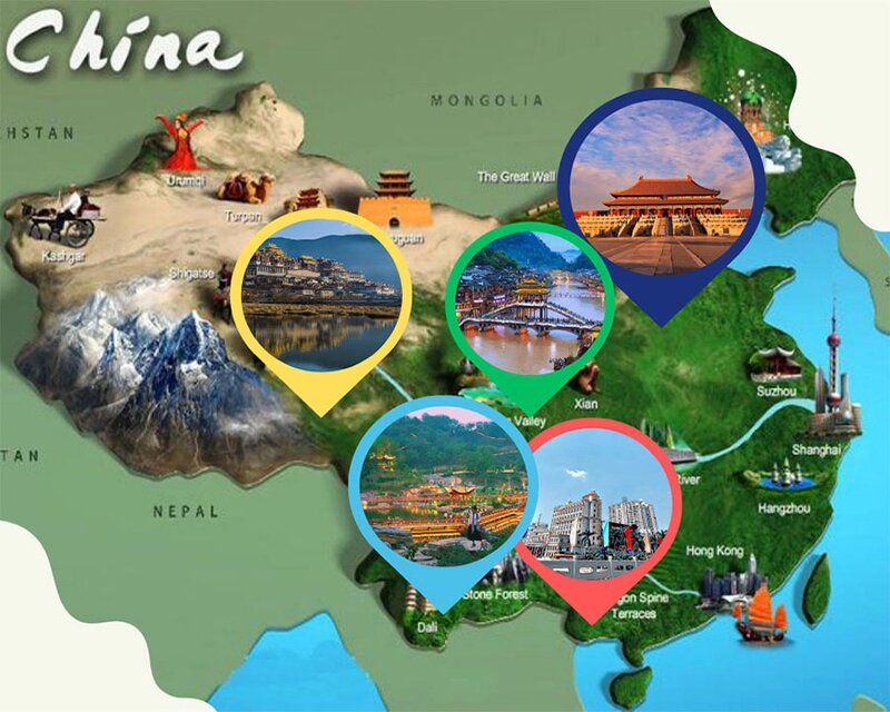 Dưới đây là những điểm đến tiêu biểu thường được thể hiện nổi bật trên bản đồ du lịch Trung Quốc.