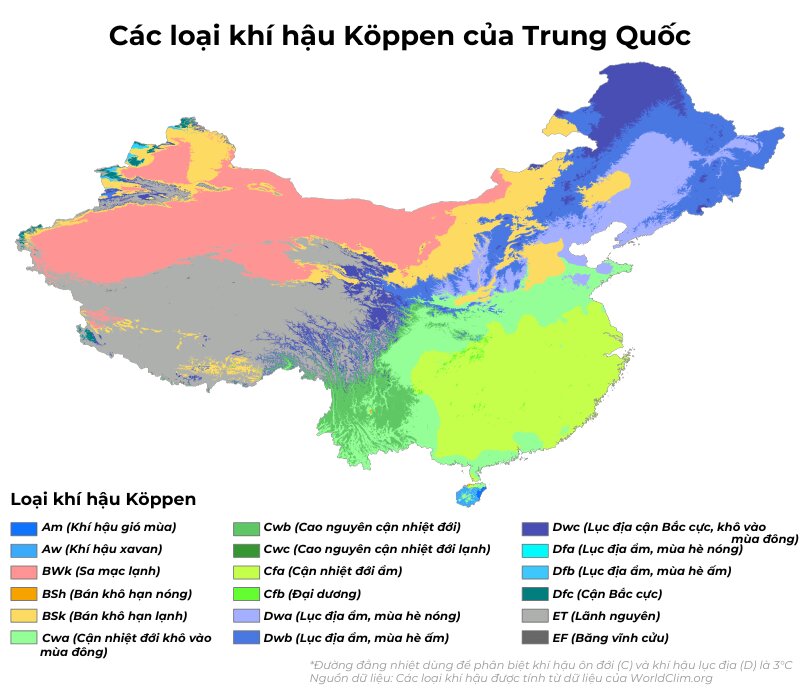 Do lãnh thổ trải dài theo nhiều vĩ độ và có sự chênh lệch độ cao lớn, khí hậu Trung Quốc vô cùng đa dạng. Bản đồ khí hậu thể hiện rõ sự khác biệt giữa các vùng miền.
