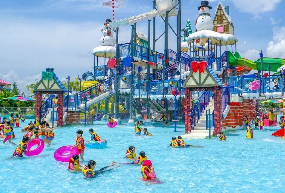 Khu vui chơi trẻ em trong công viên nước cũng được đầu tư riêng biệt, với mực nước nông, nhiều trò chơi phun nước và cầu trượt mini, giúp các bé thỏa sức vui đùa trong môi trường an toàn.
